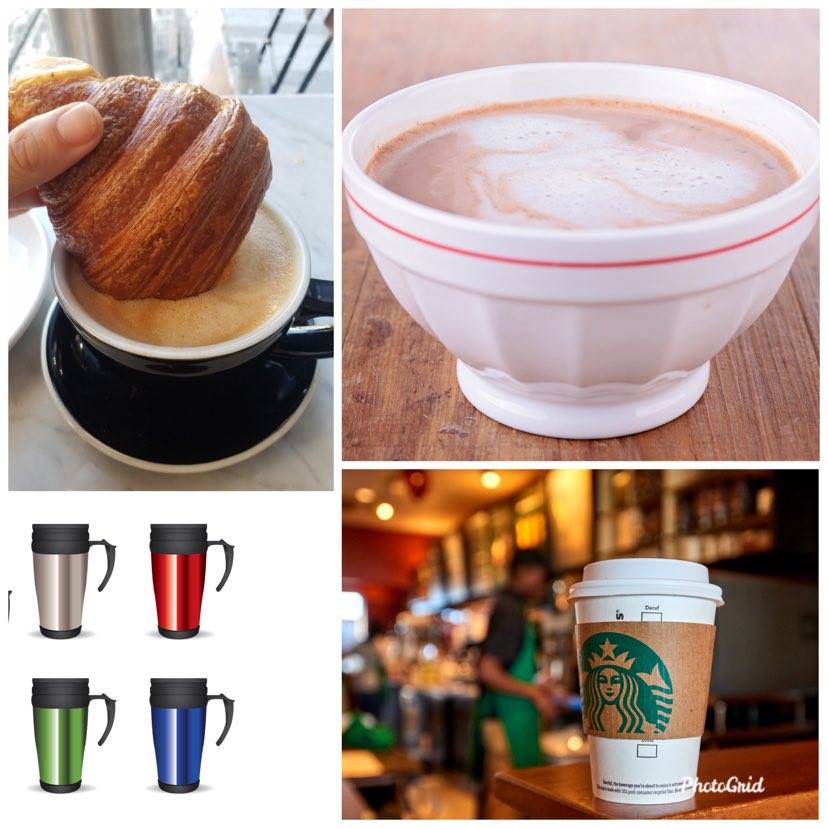 Pour changer un peu, aujourd’hui je viens à vous, pour essayer de vous faire sourire avec un exemple d’habitude culturelle. Les américains sont très souvent outrés par deux de nos petites habitudes de français au petit-déj. La première et ce qui est presque regardé comme un sacrilège. Tremper son croissant ou sa tartine dans son café. Oh my god! Quel affront! L’idée derrière cela, c’est : « Mais pourquoi ? Oh pourquoi, ruiner ce parfait croissant ? »La deuxième habitude qui les laisse sans voix, c’est de prendre son café du matin dans un bol. Là, ils ne comprennent tout simplement pas. Ah, culture quand tu nous tiens ! Pour info : Pour les américains, généralement le matin c’est Starbucks ou alors un mug ou encore une gourde thermos (Je vous laisse regarder les photos).